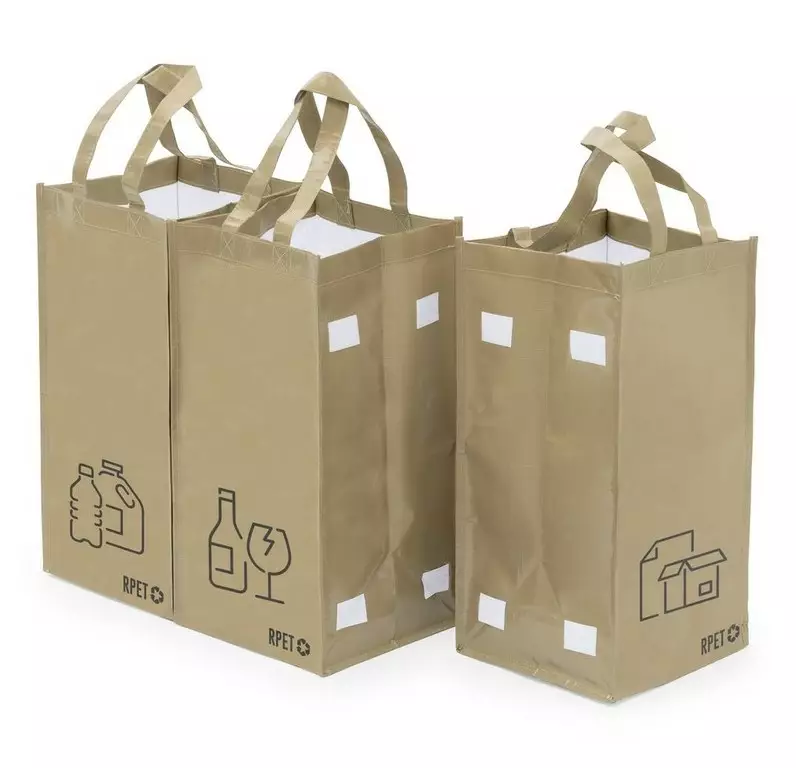 Tarroilla toisiinsa kiinnittyvät kestokassit kierrätettävälle lasille, paperille ja muoville.